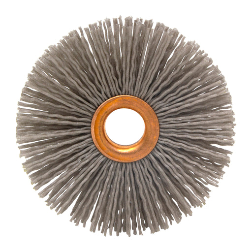 BRM's Abrasive Nylon Copper Center Wheel Brush features a 3.500" brush diameter with a 1.185" trim length, .750" face width and a .625" arbor hole....