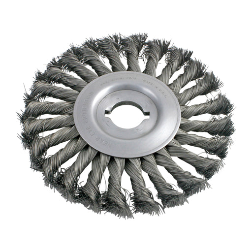 BRM B464, 8" Diameter Knotted Wheel Brush, .016 Carbon Steel, 1" Arbor Hole With Keyway