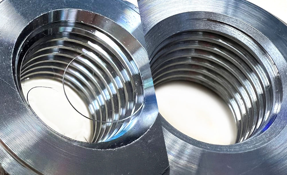 If thread burrs are left unremoved, this can interfere with thread engagement, compromise sealing surfaces, and lead to cross-threading, galling, or premature wear, especially in applications requiring fluid-tight seals or precise mechanical assembly. Thread deburring ensures clean, smooth threads that are critical for proper assembly, long-term component reliability, and resistance to corrosion. This is particularly important in industries such as aerospace, automotive, hydraulics, and precision manufacturing, where internal threads in cylinders must meet tight tolerances and perform under high stress or pressure. BRM is proud to offer American-Made FLEX-HONE® tools and abrasive nylon spiral tube brushes to address thread deburring applications.